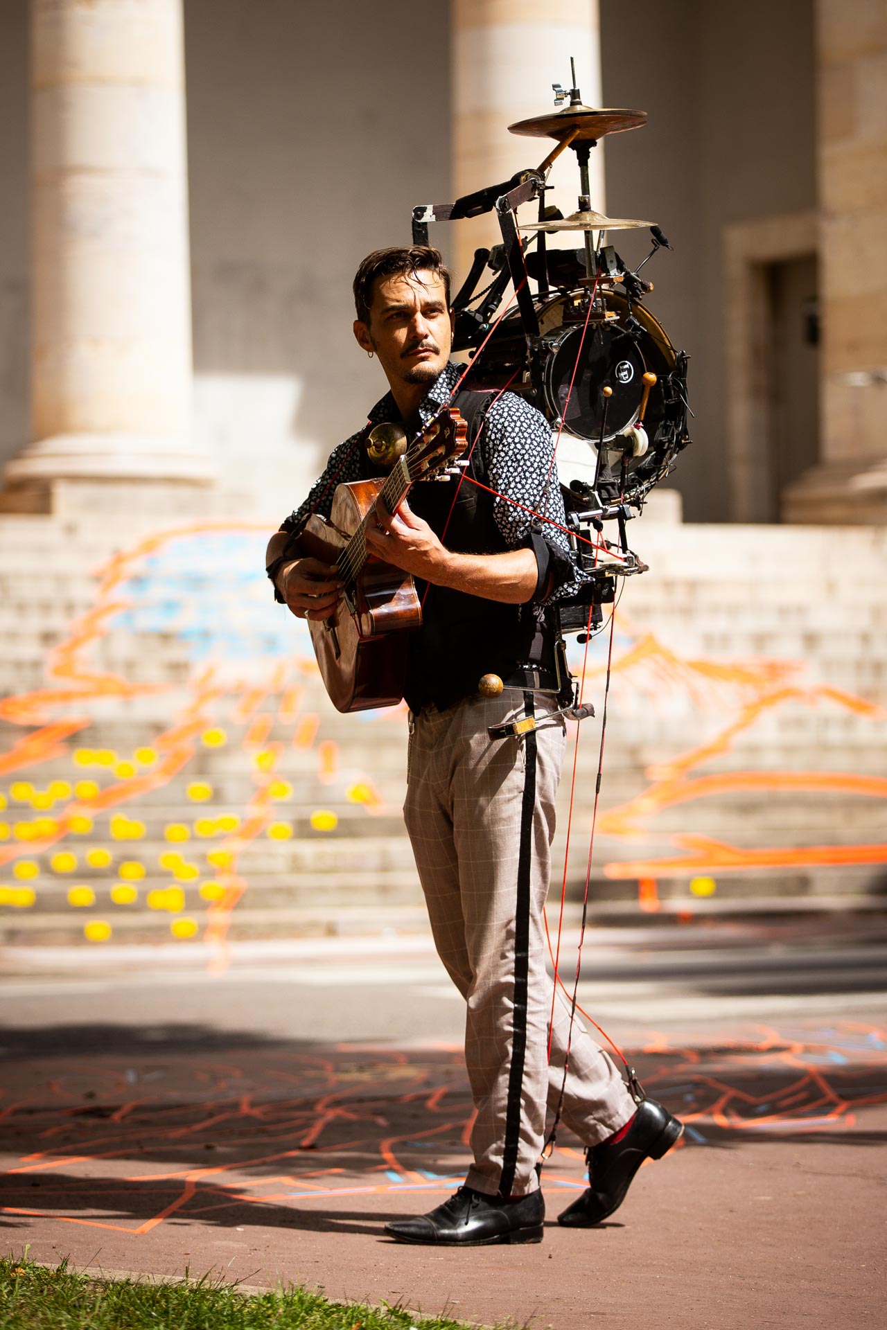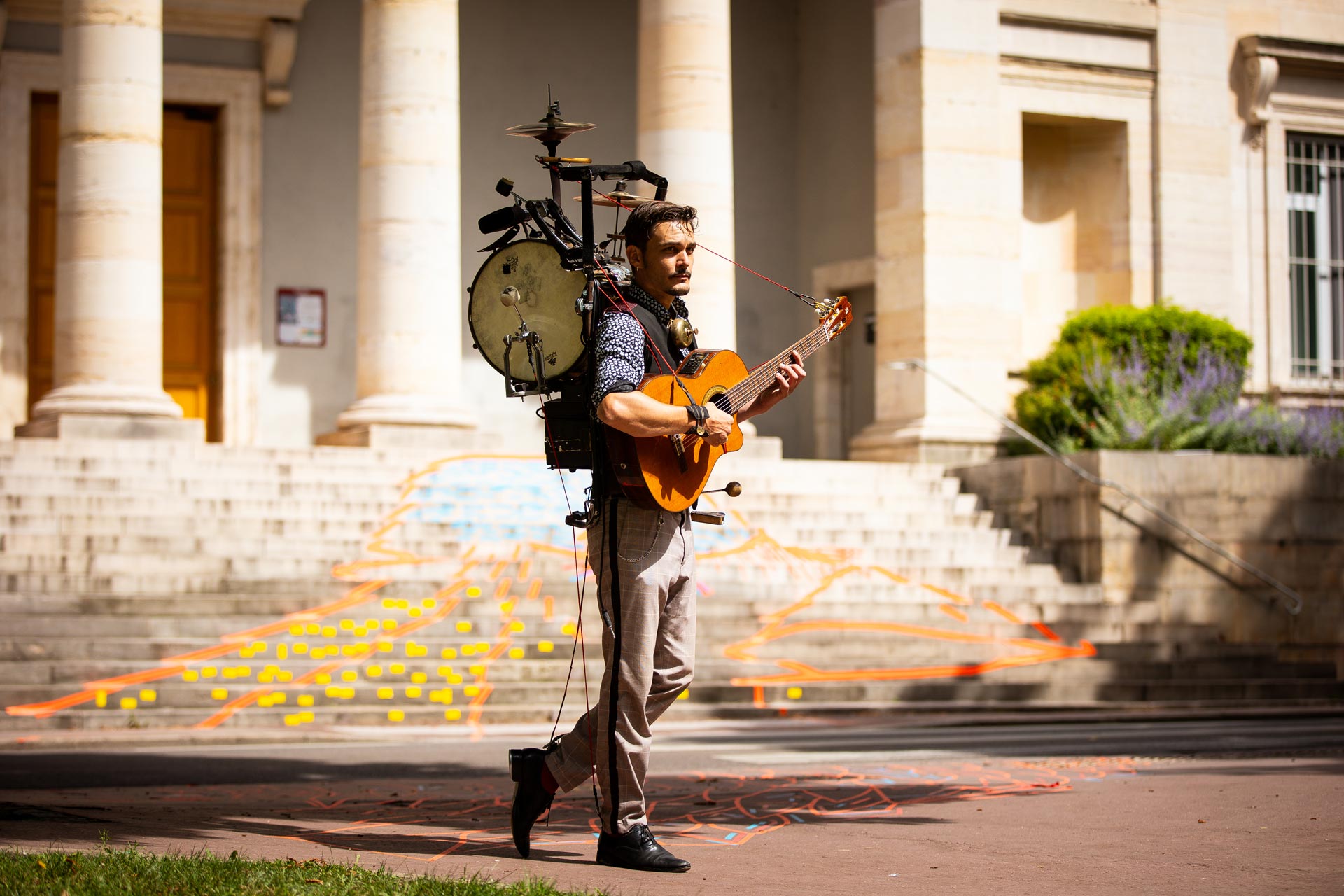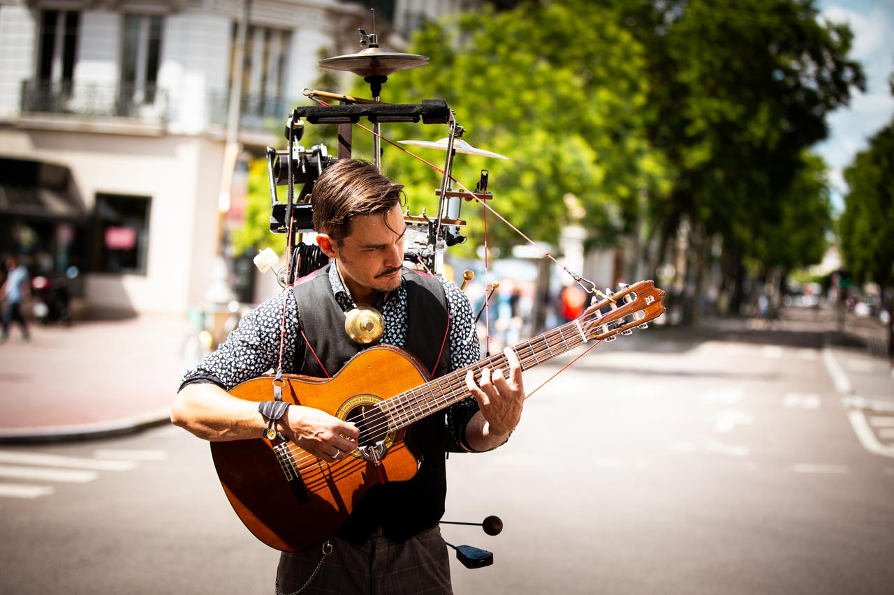 La musique s’anime à travers la performance envoûtante du multi-instrumentiste argentin Santiago Moreno. Par un réseau de fils et de poulies, le corps de l’artiste est relié à un instrumentarium qu’il porte sur le dos.