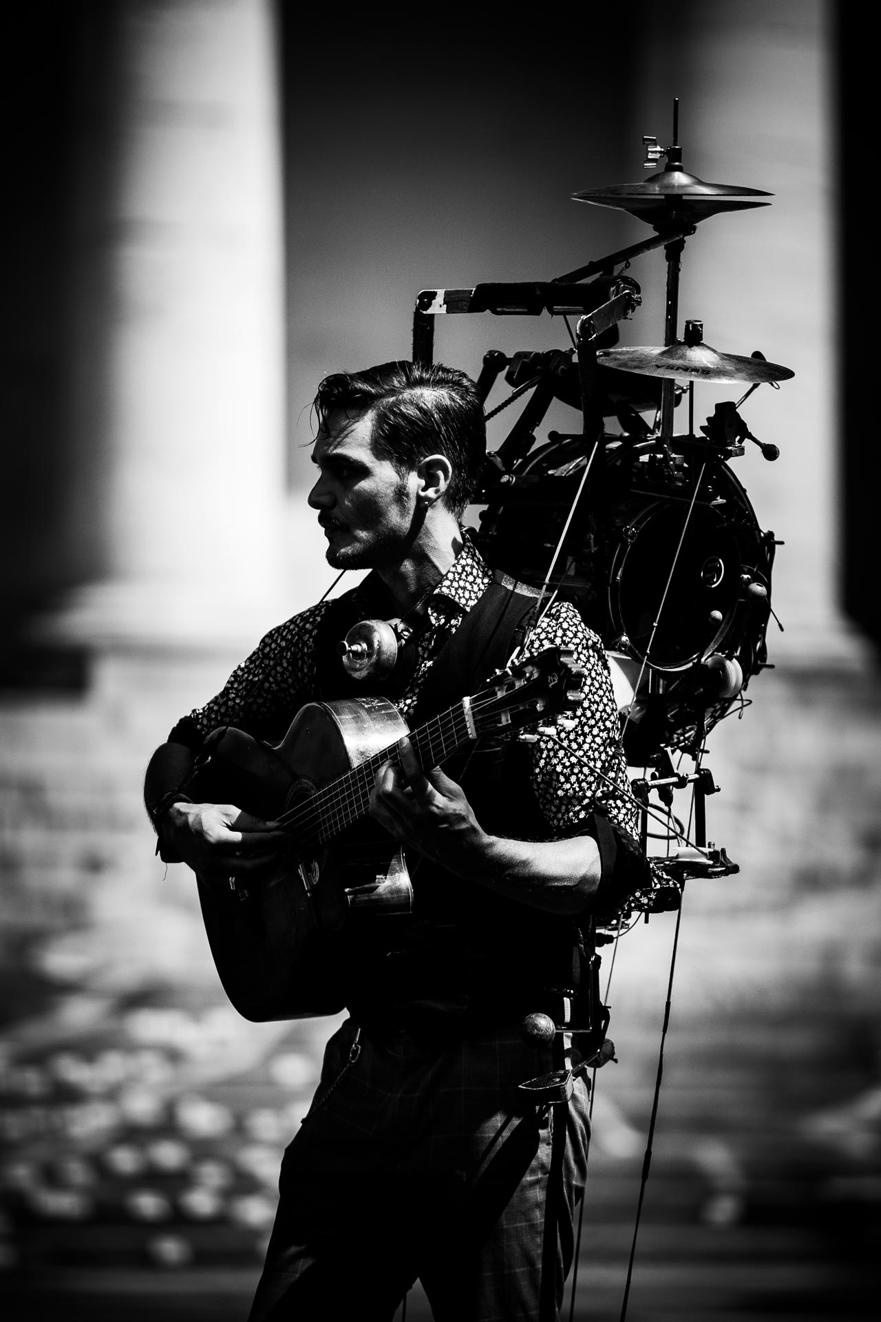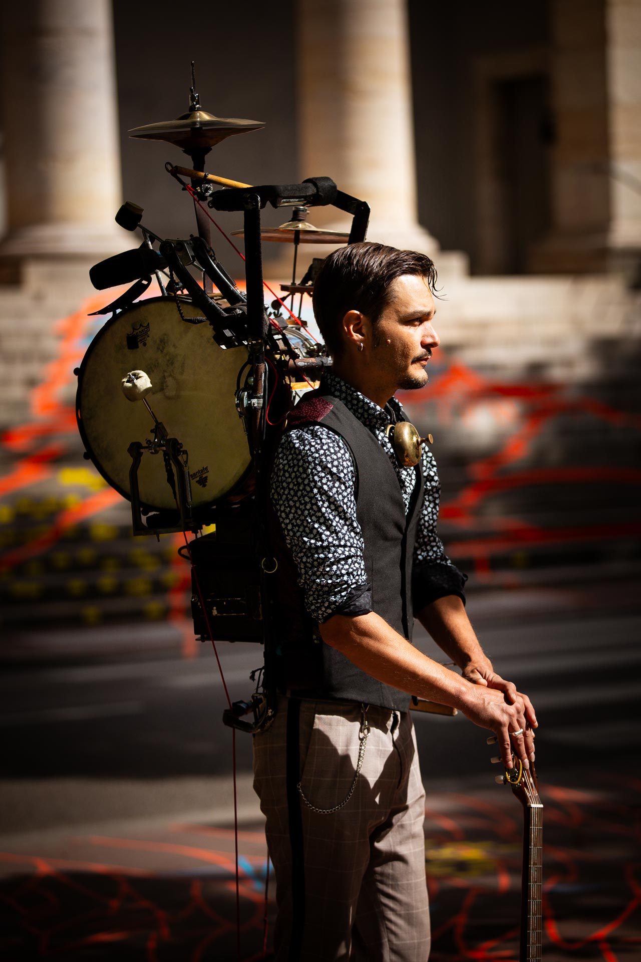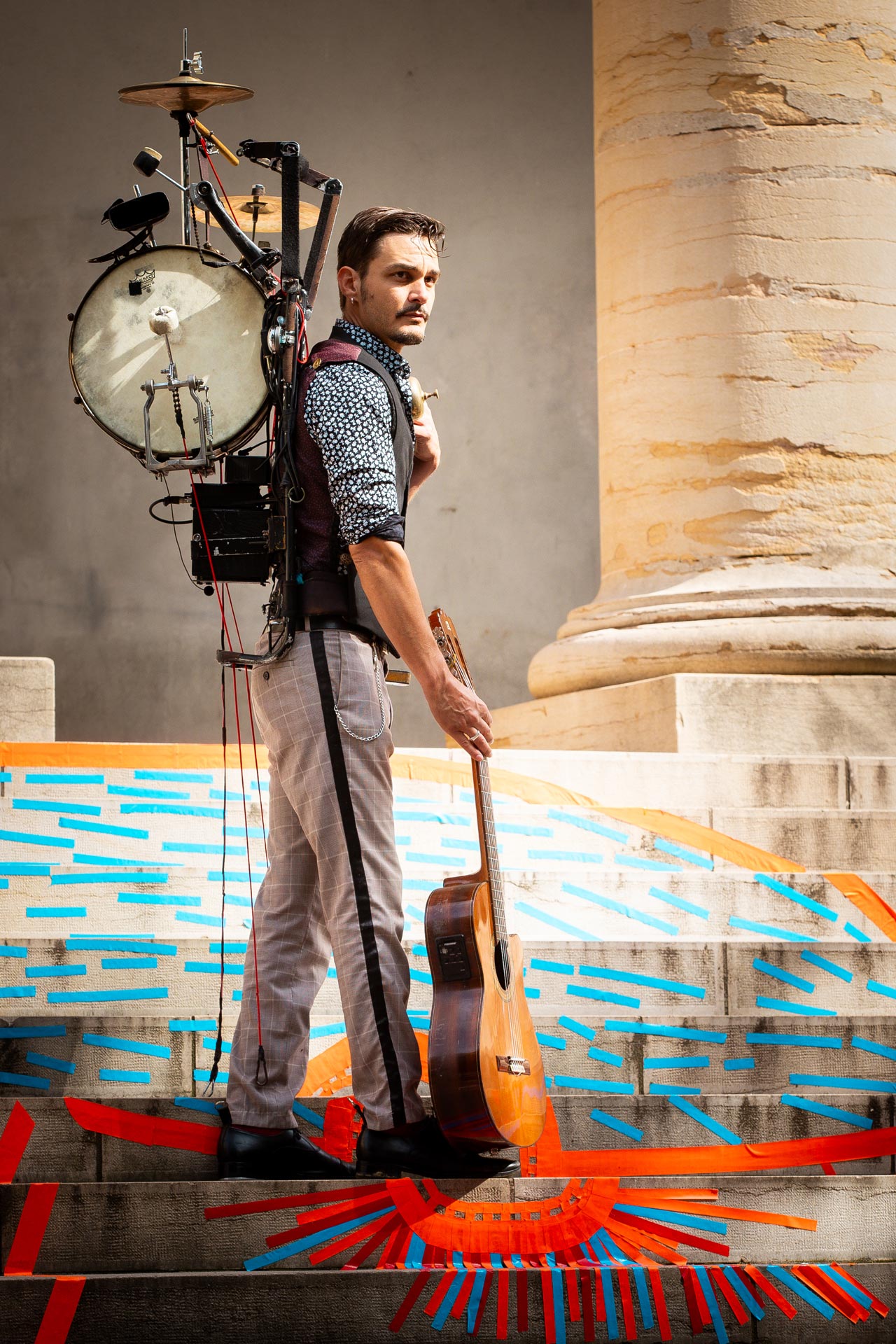 La musique s’anime à travers la performance envoûtante du multi-instrumentiste argentin Santiago Moreno. Par un réseau de fils et de poulies, le corps de l’artiste est relié à un instrumentarium qu’il porte sur le dos.